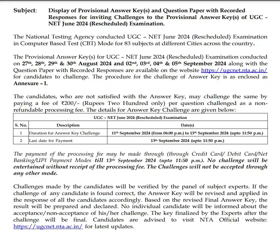 The processing fee must be paid by 11:50 p.m. on September 13, 2024. If the processing money is not received, challenges will not be accepted. If the processing fee is not paid, no challenges will be allowed. Experts in the field will verify the challenges. The Answer Key will be updated and applied to each candidate’s response appropriately if a challenge is determined to be accurate. The updated UGC NET Final Answer Key 2024 will serve as the basis for preparing the UGC NET 2024 result. Following this procedure, the key will be final, and no contender will be notified if their challenge is accepted or rejected.